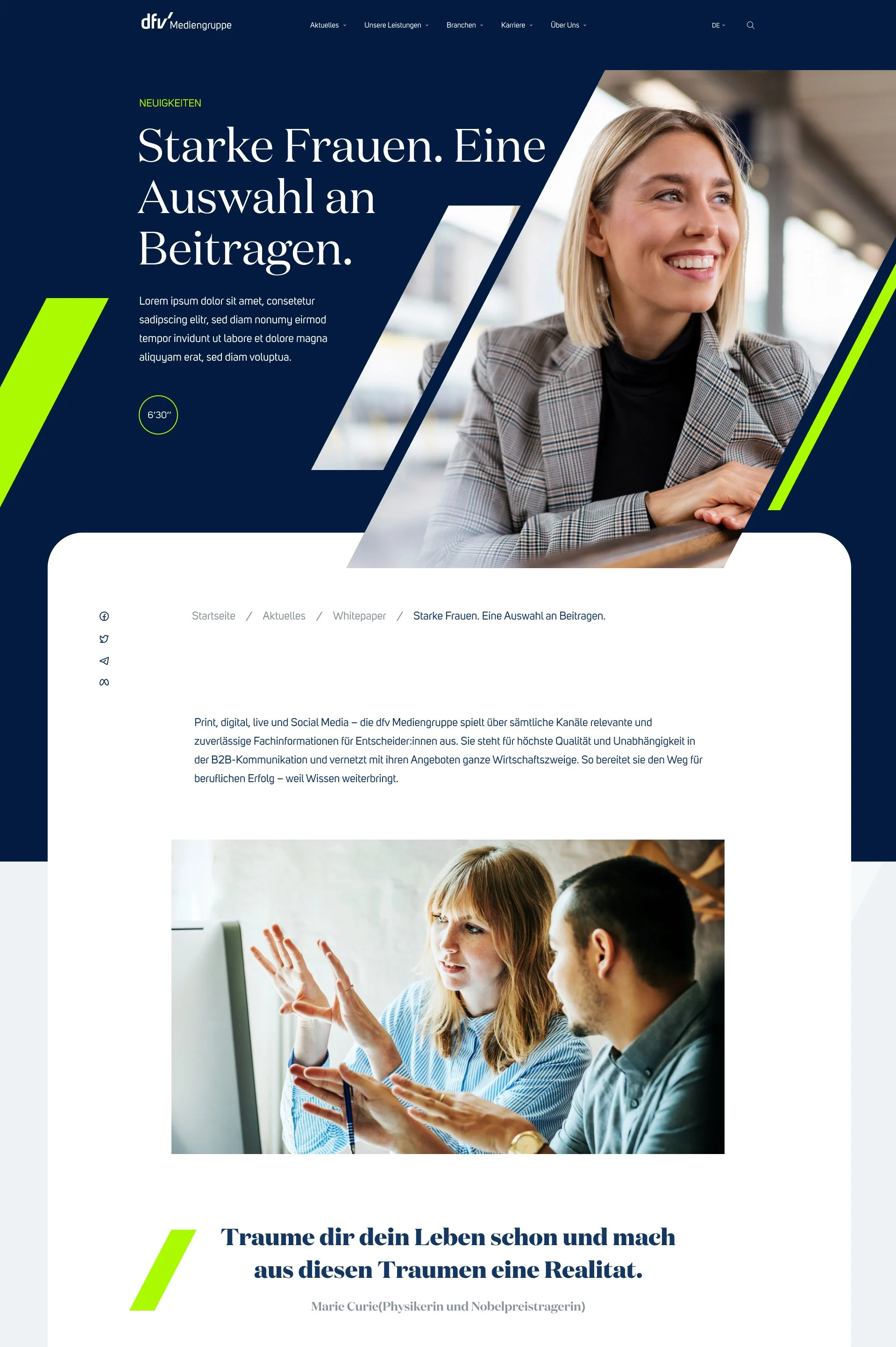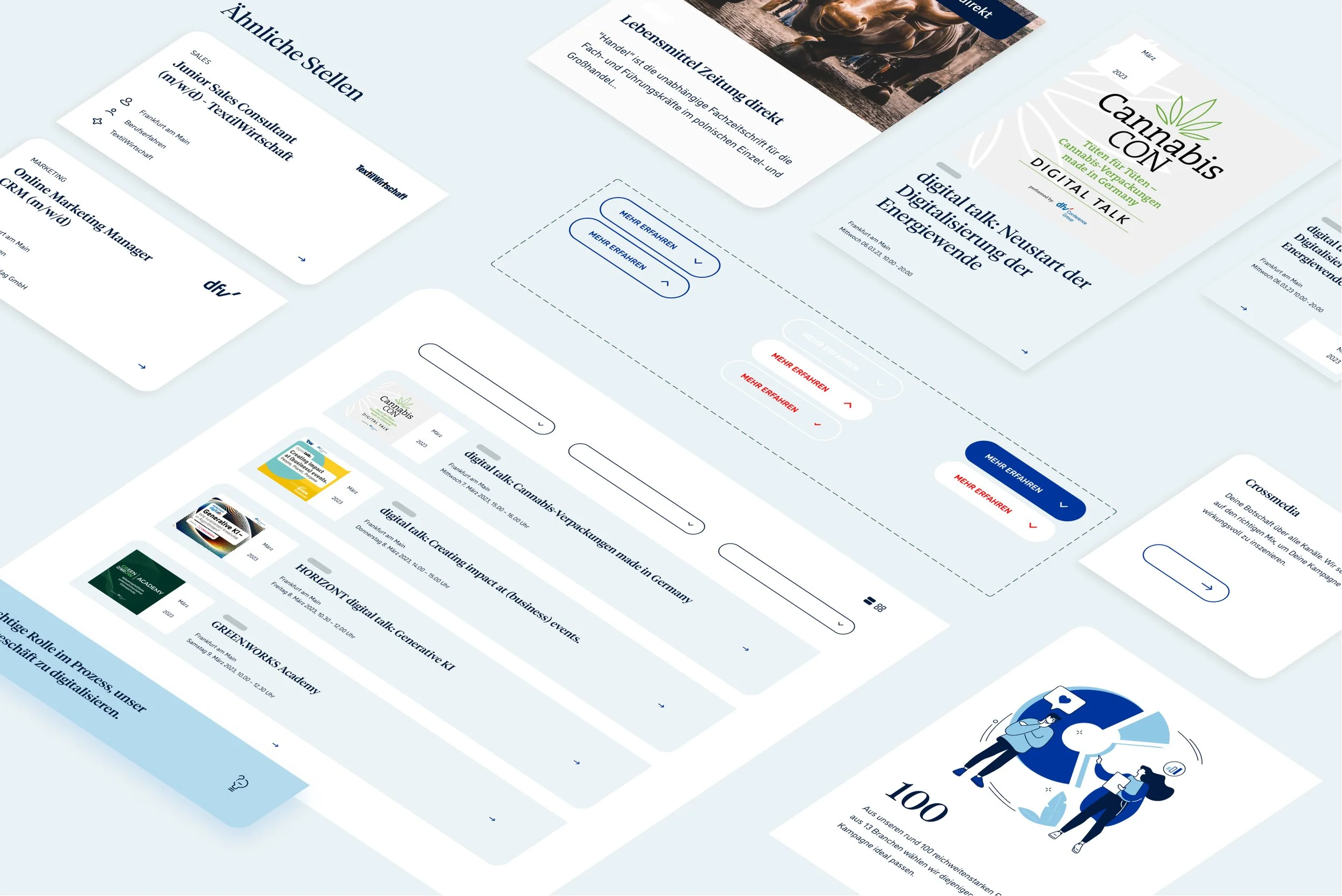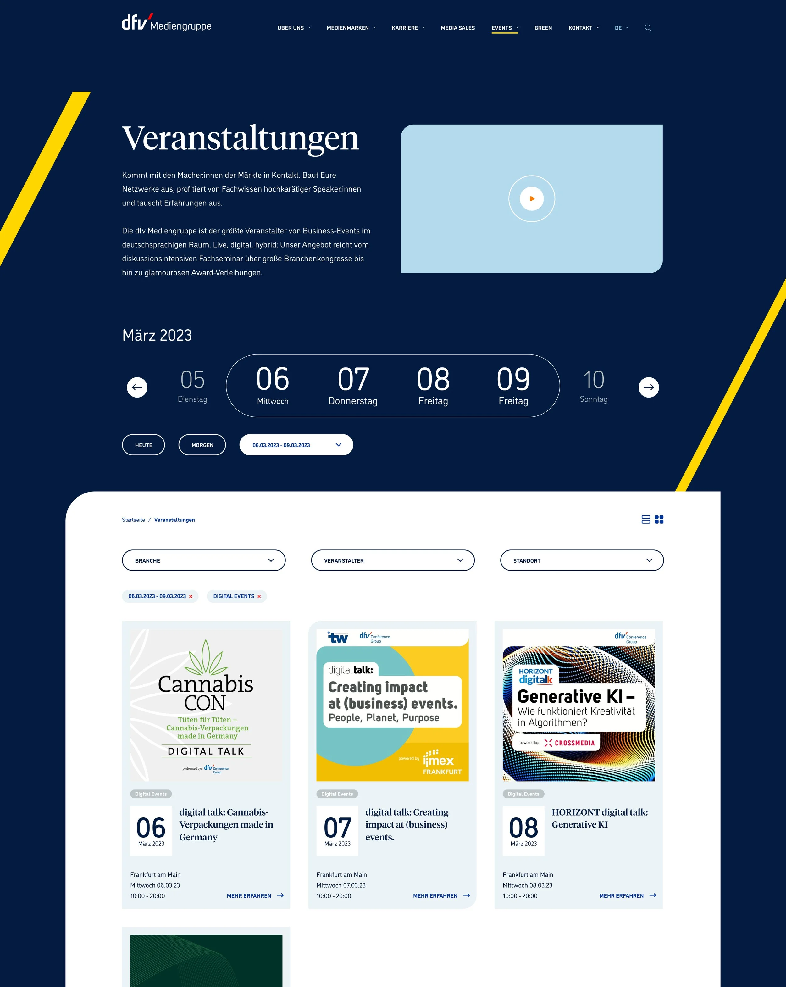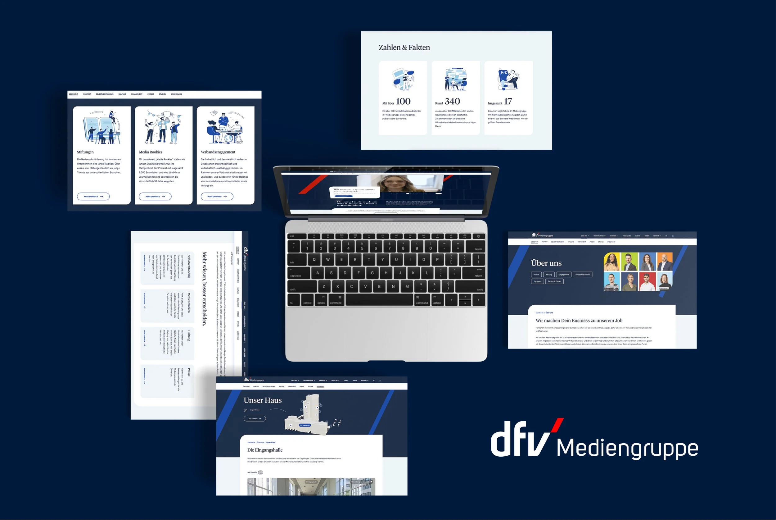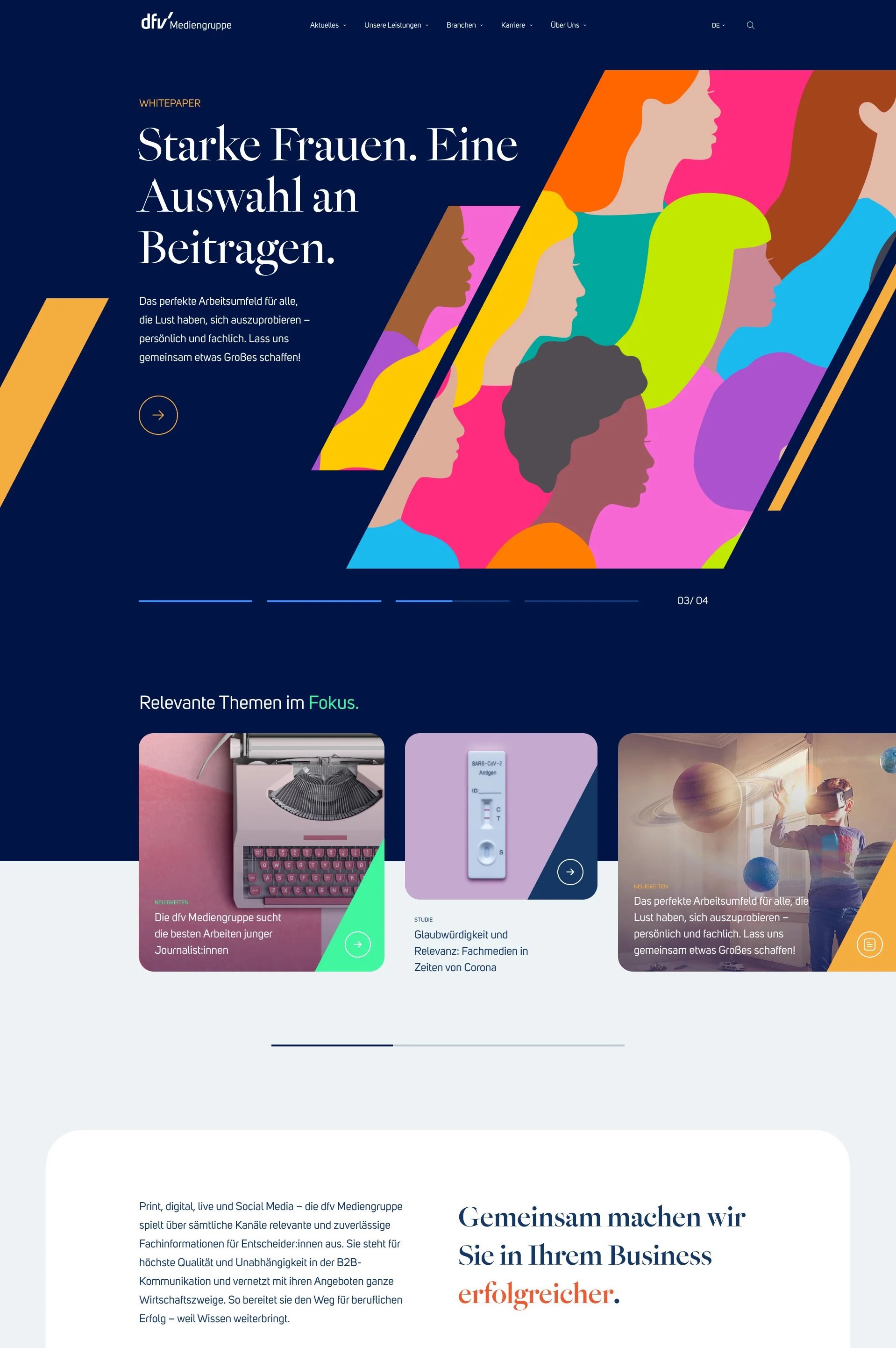 Die neue Website spiegelt die Weiterentwicklung seit dem letzten Relaunch 2014 wider. Sie strahlt Seriosität aus, bleibt jedoch alles andere als langweilig. Viele Bilder und Videos stellen die Kollegen vor, während persönliche Geschichten wertvolle Einblicke bieten. Zudem fassen die gebündelten Informationen zu den Themenwelten des dfv das vielseitige Angebot zusammen und erleichtern den Besuchern die Erfassung der Inhalte. Damit fördert die überarbeitete Website den Austausch unter Fachleuten und unterstützt Entscheider dabei, in ihrem Bereich erfolgreich zu sein.